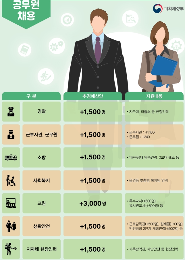 중앙공무원은 경찰관 1500명, 부사관(1160명)과 군무원(340명) 1500명, 근로감독관ㆍ집배원ㆍ인천공항 제2터미널 종사자 1500명 등이다. 지방공무원은 사회복지공무원 1500명, 소방관 1500명, 교사 3000명, 가축방역관ㆍ재난안전 등 현장인력 1500명을 뽑을 계획이다.