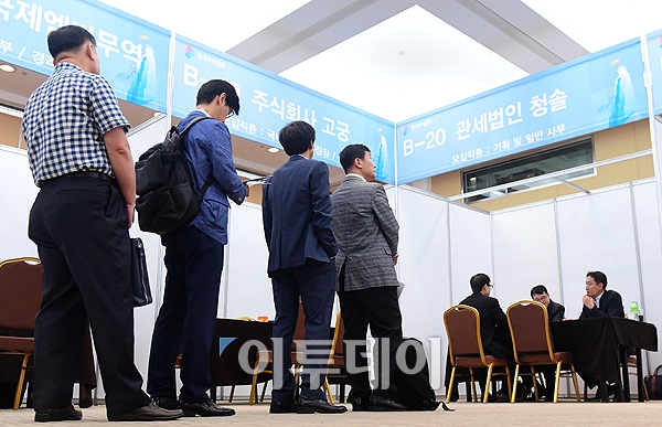 2017 중장년 전문인력 채용박람회가 8일 서울 삼성동 코엑스에서 열린 가운데 구직자들이 취업상담을 받기 위해 줄을 서고 있다. 이날 행사에는 중장년 구직자 2000명을 대상으로 50개사가 함께하는 현장박람회와 200개사가 참여하는 온라인 박람회가 동시에 진행됐다. 고이란 기자 photoeran@