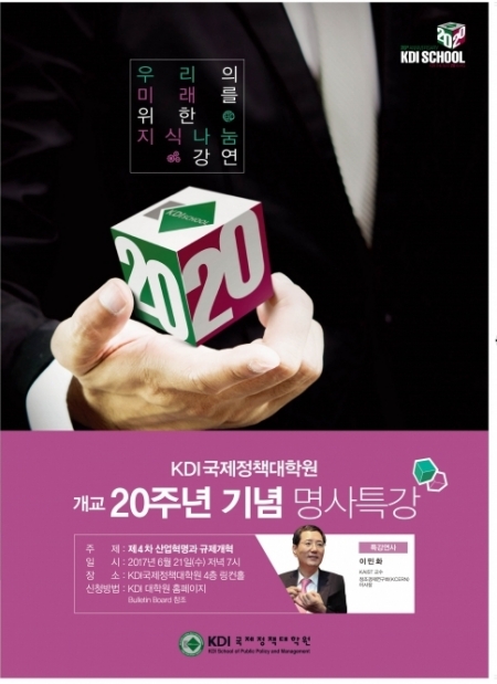KDI국제정책대학원(이하 KDI대학원)은 오는 21일 오후 7시 KDI대학원 4층 링컨홀에서 개교 20주년 기념 명사특강 시리즈 4차 강연을 개최한다.