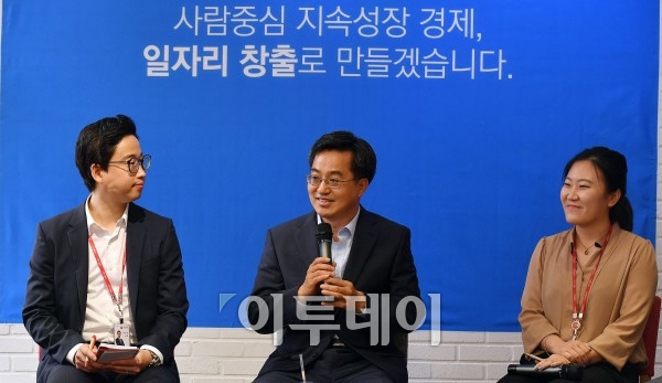 취임 후 첫 일자리 현장방문에 나선 김동연 경제부총리 겸 기획재정부장관이 15일 서울 서초구 아이티센을 찾아 직원들과 대화하고 있다. 이동근 기자 foto@