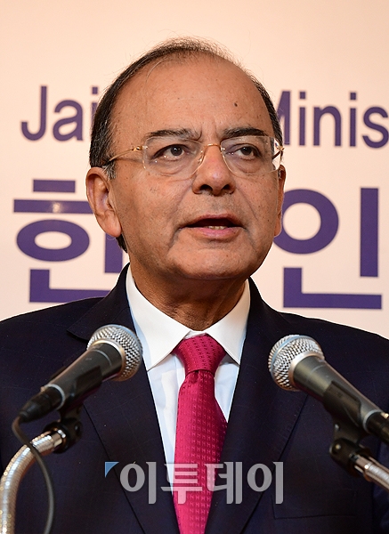 아룬 제이틀리 인도 재무부 장관이 15일 서울 소공동 롯데호텔에서 열린 ‘인도 재무장관 초청 한-인도 비즈니스 포럼’에서 기조연설을 하고 있다. 고이란 기자 photoeran@