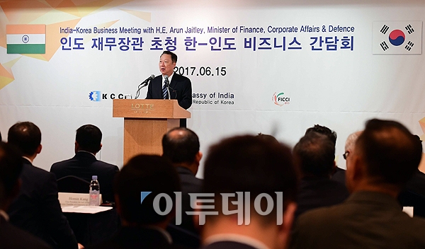 박용만 대한상공회의소 회장이 15일 서울 소공동 롯데호텔에서 열린 ‘인도 재무장관 초청 한-인도 비즈니스 포럼’에서 인사말을 하고 있다. 고이란 기자 photoeran@