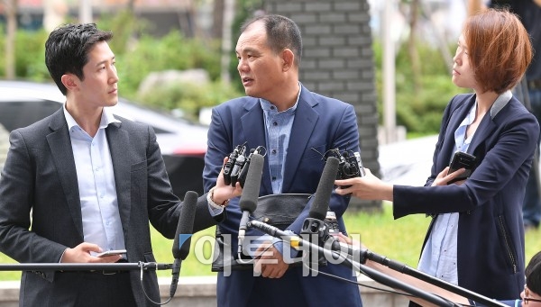 지난 대선때 문재인 대통령 아들 준용씨에 대한 입사특혜 의혹관련 제보 내용 조작사건과 관련해 검찰에 소환된 김성호 전 국민의당 공명선거추진단 수석부단장이 3일 서울 양천구 서울남부지검으로 피고발인 신분으로 출석해 취재진의 질문에 답하고 있다. 이동근 기자 foto@
