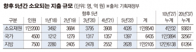 이번 추경안 일자리 창출은 공공부문에 중점을 두고 있다. 증원되는 공무원 1만2000명 내역을 부문별로 살펴보면 △국민안전부문에서 소방(1500명), 경찰(1500명), 군 부사관 및 군무원(1500) 등 총 4500명 △복지부문에서 사회복지공무원 1500명 △교사부문에서 특수교사(600명), 유치원 교사(800명) 등 총 3000명 △생활안전부문에서 근로감독관(500명), 집배원(100명), 인천공항 제2터미널 CIQ 인력(500여 명) 및 수입물품 통관원·불법체류단속·환경감시원(300여 명), 가축방역관·재난안전 등 현장인력(1500명) 등 3000명이다. 추경안 예산에서 이들의 채용과 교육훈련에 소요되는 경비는 80억 원으로 책정됐다. 그러나 공무원 증원 시 향후 5년간 소요되는 지출 규모는 1조8540억 원으로 나타났다. 10년 후엔 4조32억 원, 20년 후엔 9조3831억 원이 든다는 게 예결위의 분석이다.