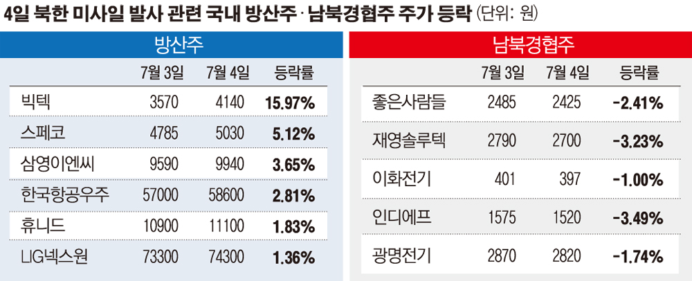 지정학적 리스크가 부각되면서 방위산업 관련주는 일제히 급등했다. 전자전 장비 제조업체인 빅텍은 전날보다 15.97% 치솟은 4140원에 거래를 마쳤다. 방산설비업체 스페코가 5.12% 올랐고 삼영이엔씨(3.65%), 한국항공우주(2.81%), 휴니드(1.83%), LIG넥스원(1.36%) 등이 강세를 보였다.