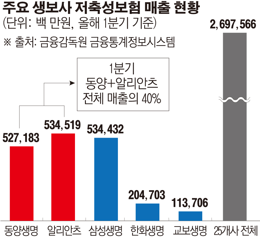 6일 보험업계에 따르면 올해 1분기 기준(초회보험료) 알리안츠생명(5345억 원)과 동양생명(5272억 원)은 저축성보험을 총 1조617억 원치 팔았다. 25개 생명보험사 전체 저축성보험 매출(2조6976억 원)의 40%에 육박(39.4%)하는 규모다.