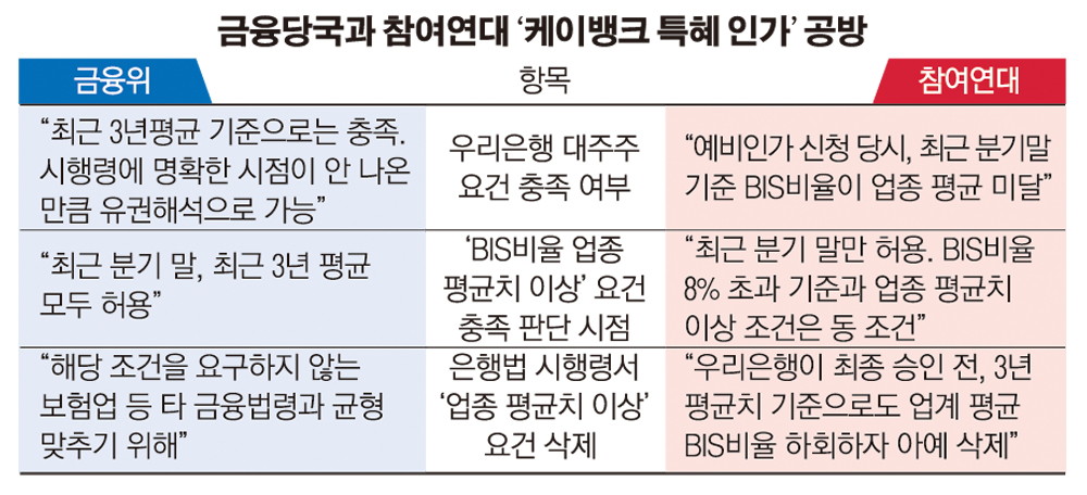 인터넷은행 케이뱅크의 대주주인 우리은행이 승인 당시 적격성 요건을 충족했는지를 두고 금융당국과 참여연대가 전면전을 벌이고 있다. 우리은행이 재무건전성 요건을 충족하지 못했다는 의혹이 사실로 밝혀지면 케이뱅크의 은행업 인가 취소 사유가 될 수 있어 논란이다.