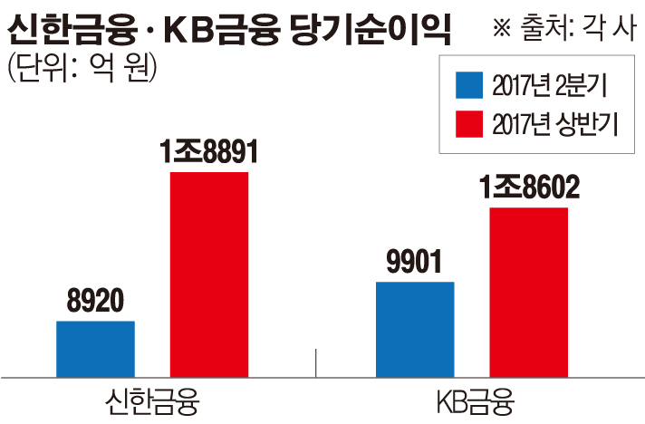 다만 주력 계열사 순익 경쟁에서는 KB국민은행이 올 2분기 5457억 원의 당기순이익을 기록해 신한은행(5698억 원)에 역전당했다. 앞서 지난 1분기에는 국민은행(6635억 원)이 신한은행(5346억 원)을 앞선 바 있다.