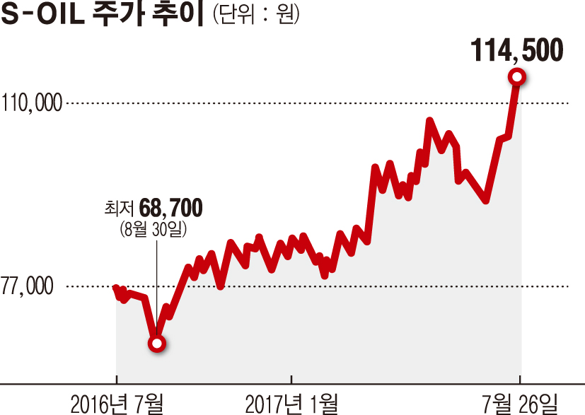 2017년 2분기 어닝쇼크에도 불구하고 에쓰오일(S-oil)의 주가가 급등세다. 국제유가 하락세가 일시적 현상에 그쳤고, 정제마진 강세로 하반기 실적이 회복세로 돌아설 것이란 전망이 지배적이다.
