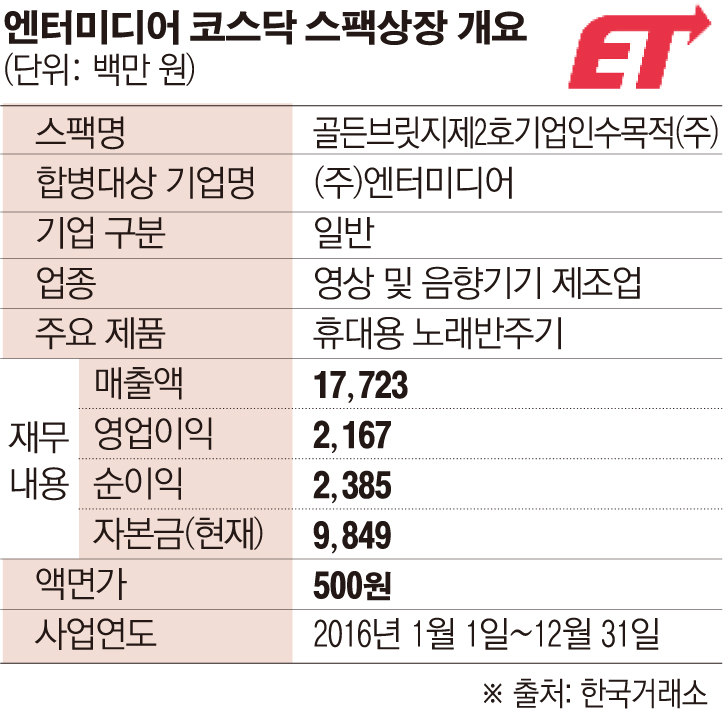 엔터미디어는 골든브릿지제2호기업인수목적과 합병을 통해 상장한다. 엔터미디어는 휴대용 노래반주기를 만드는 영상 및 음향기기 제조업체로 지난해 매출액 177억2300만 원, 영업이익 21억6700만 원을 기록했다.