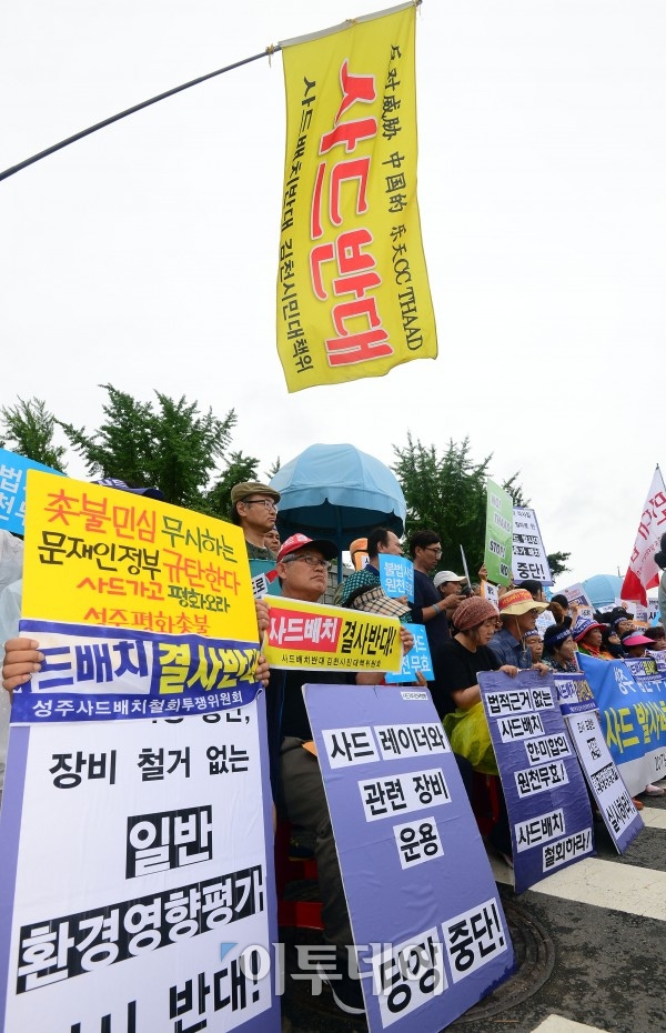 성주·김천 시민과 사드한국배치 저지전국행동 등 시민단체 회원들이 31일 서울 용산구 국방부 정문 앞에서 기자회견을 열고 문재인 대통령의 사드 발사대 4기 추가 배치 지시 철회를 촉구하는 내용의 플래카드를 들고 있다. 이동근 기자 foto@