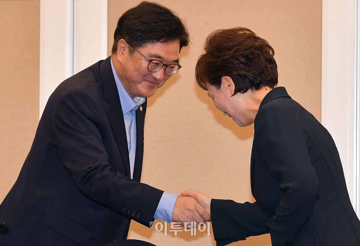 김현미 국토교통부 장관(오른쪽)과 더불어민주당 우원식 원내대표가 2일 오전 서울 여의도 국회에서 열린 주택시장 안정화방안 당정협의에서 악수하고 있다. 이동근 기자 foto@
