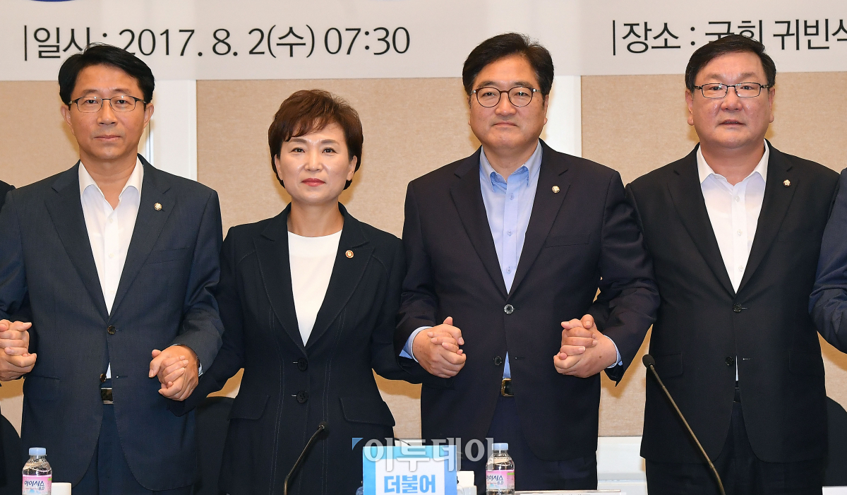조정식 국회 국토교통위원장, 김현미 국토교통부 장관, 더불어민주당 우원식 원내대표, 김태년 정책위의장(왼쪽부터)이 2일 오전 서울 여의도 국회에서 열린 주택시장 안정화방안 당정협의에서 기념촬영을 하고 있다. 이동근 기자 foto@