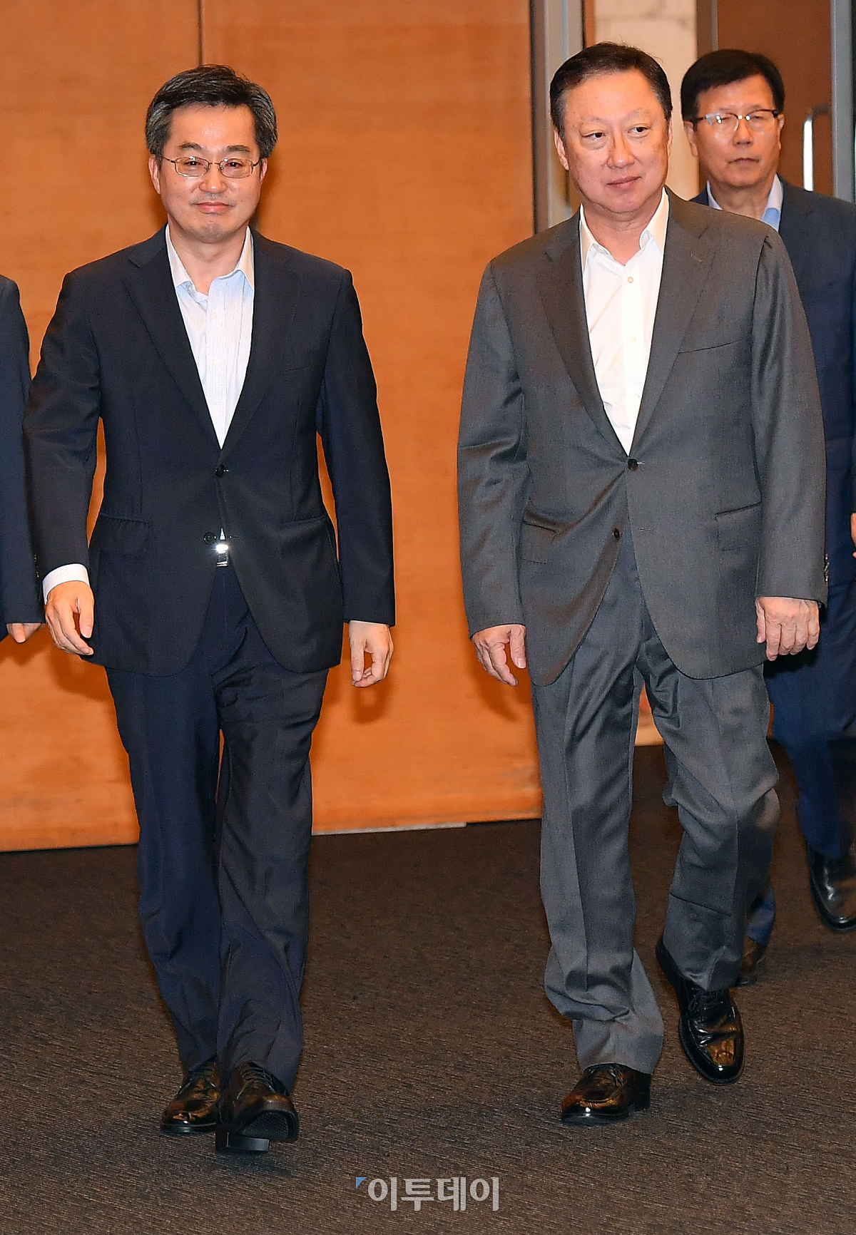 김동연 경제부총리 겸 기획재정부 장관(왼쪽)과 박용만 세제발전심의위원장 겸 대한상공회의소 회장이 2일 서울 중구 대한상공회의소에서 열린 제50차 세제발전심의위원회에 참석하기 위해 입장하고 있다. 이동근 기자 foto@