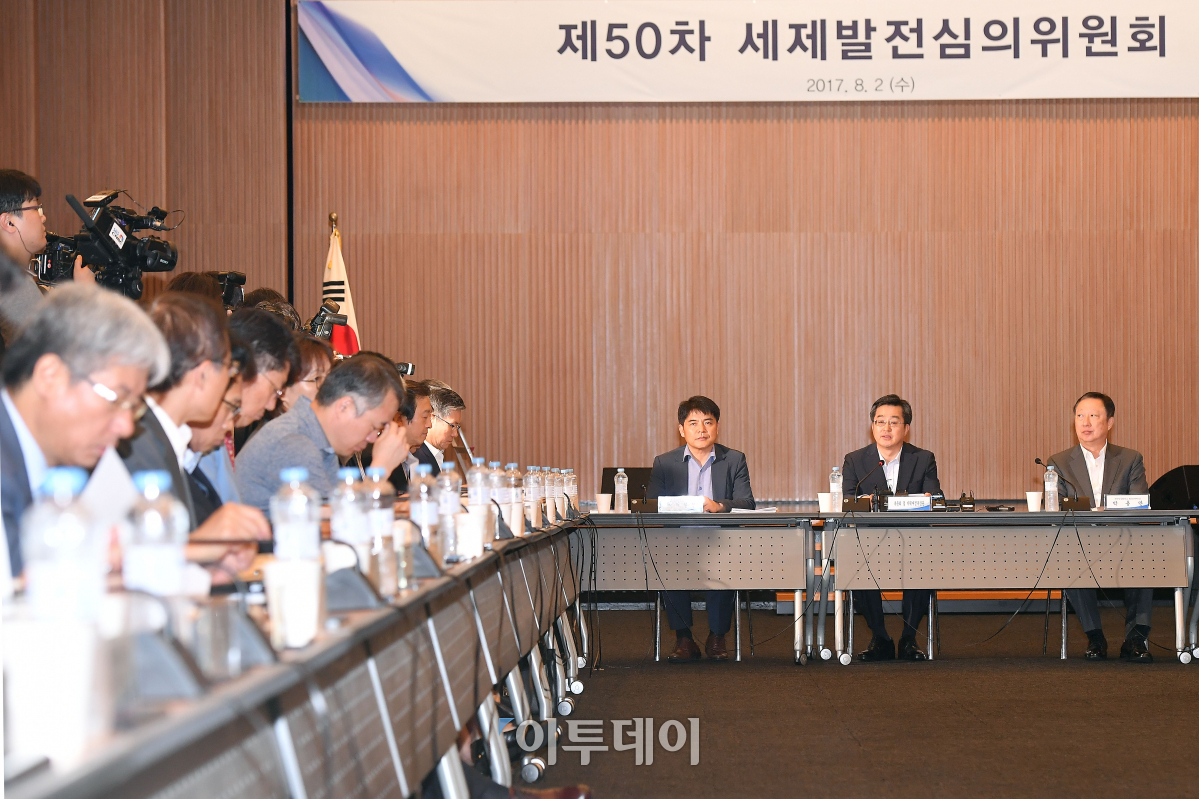 김동연 경제부총리 겸 기획재정부 장관(오른쪽에서 두 번째)이 2일 서울 중구 대한상공회의소에서 열린 제50차 세제발전심의위원회에서 모두발언을 하고 있다. 이동근 기자 foto@