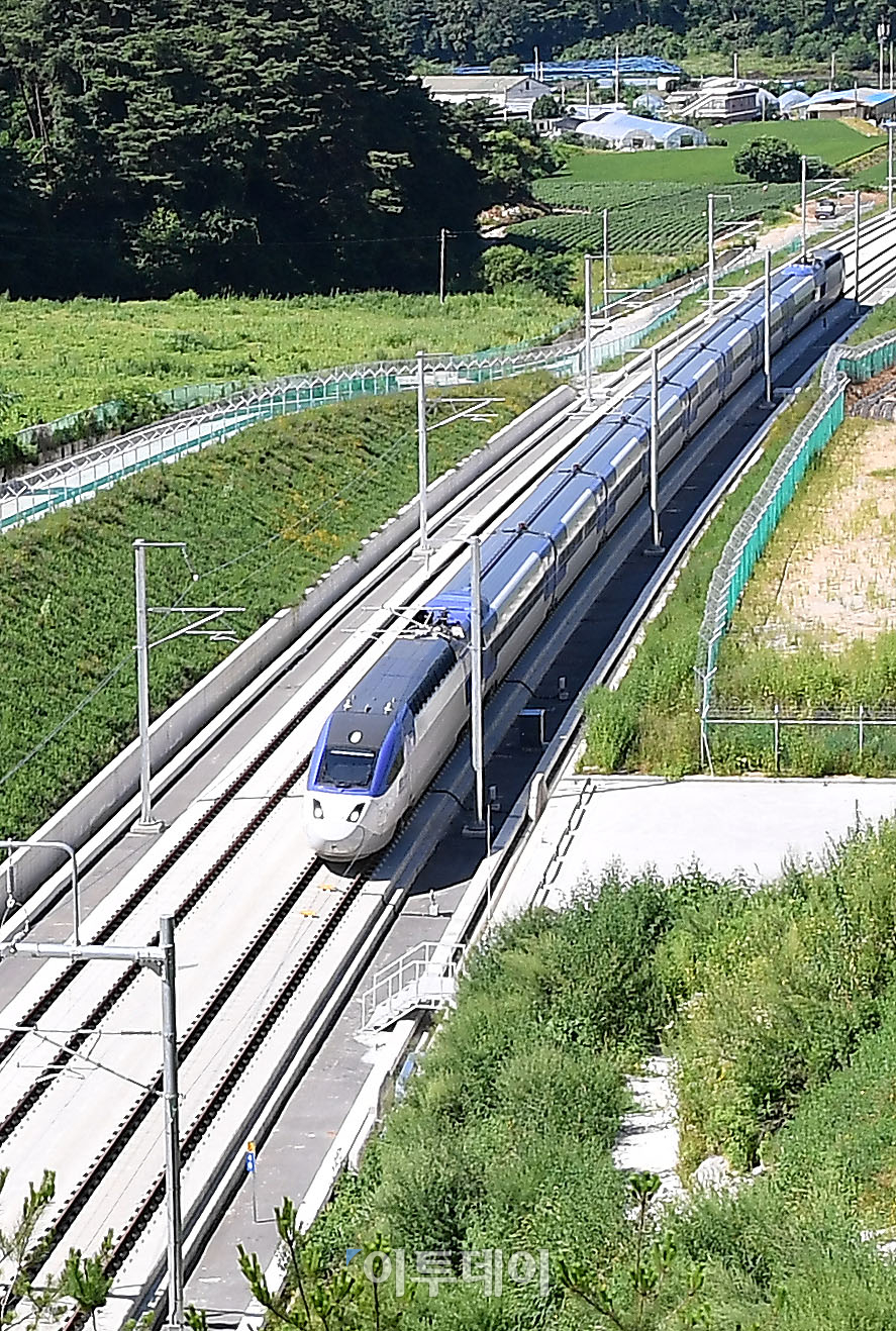 3일 오전 강원 횡성군 둔내면 인근 경강선(원주~강릉 복선전철 구간)에서 KTX산천 열차가 첫 시험운행을 하고 있다. 12월 개통을 앞둔 경강선은 이날 오전과 오후 두차례 시험운행을 시작으로 점점 속도를 높여 오는 8일 최고속도인 250km/h로 시험운행을 실시한다. 이동근 기자 foto@