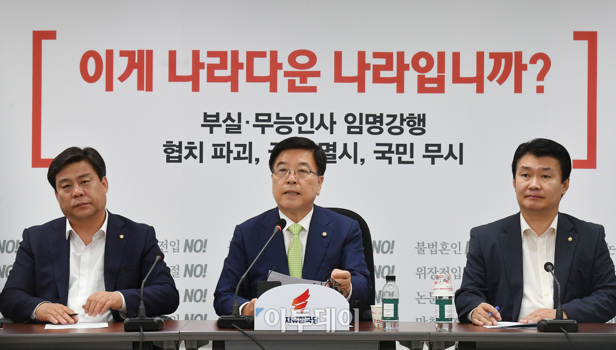 자유한국당 김광림 정책위의장 권한대행(가운데)이 4일 오전 서울 여의도 국회에서 열린 원내대책회의에서 모두발언을 하고 있다. 이동근 기자 foto@
