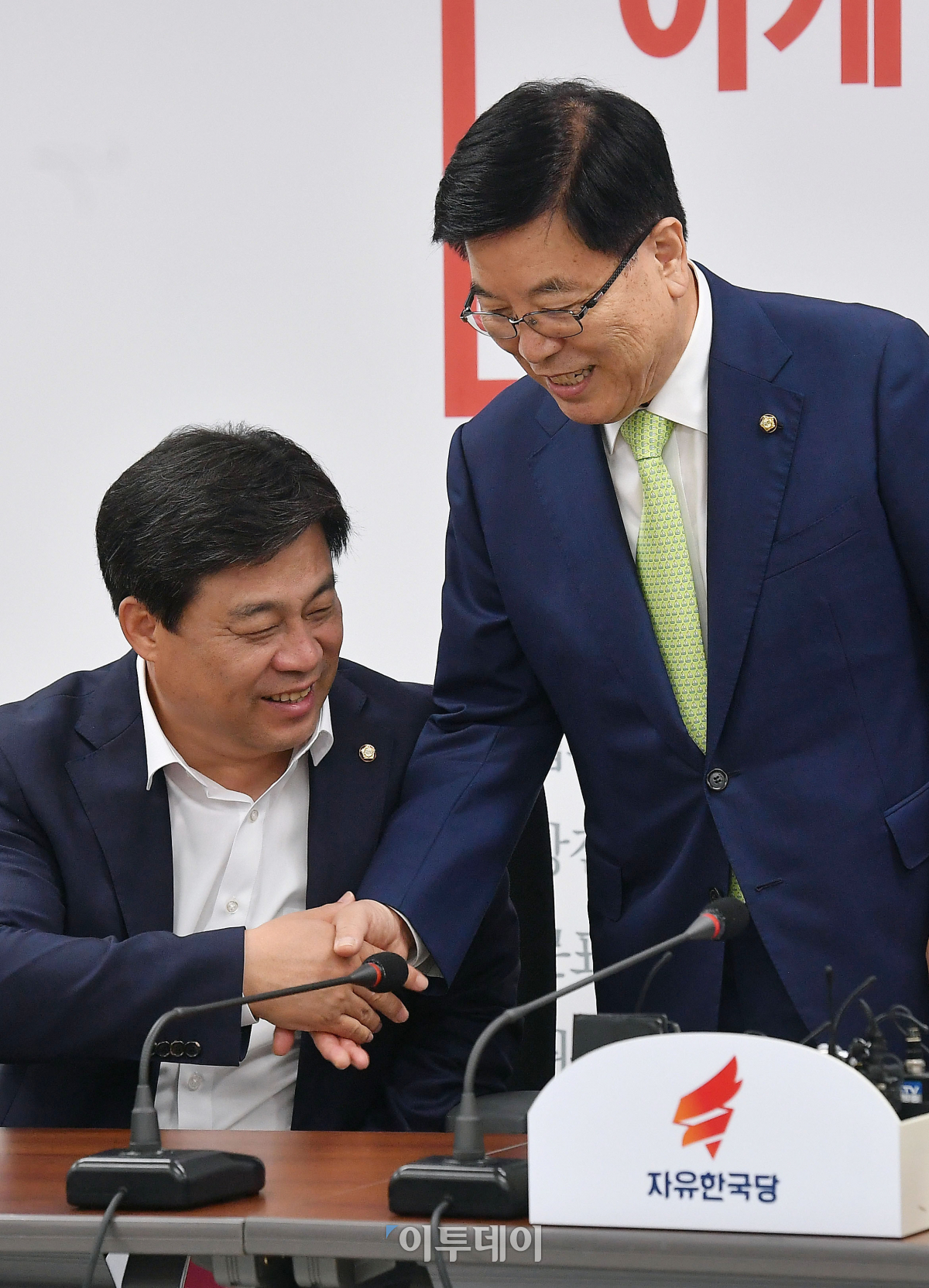 자유한국당 김광림 정책위의장 권한대행(오른쪽)과 김선동 원내수석부대표가 4일 오전 서울 여의도 국회에서 열린 원내대책회의에서 악수하고 있다. 이동근 기자 foto@
