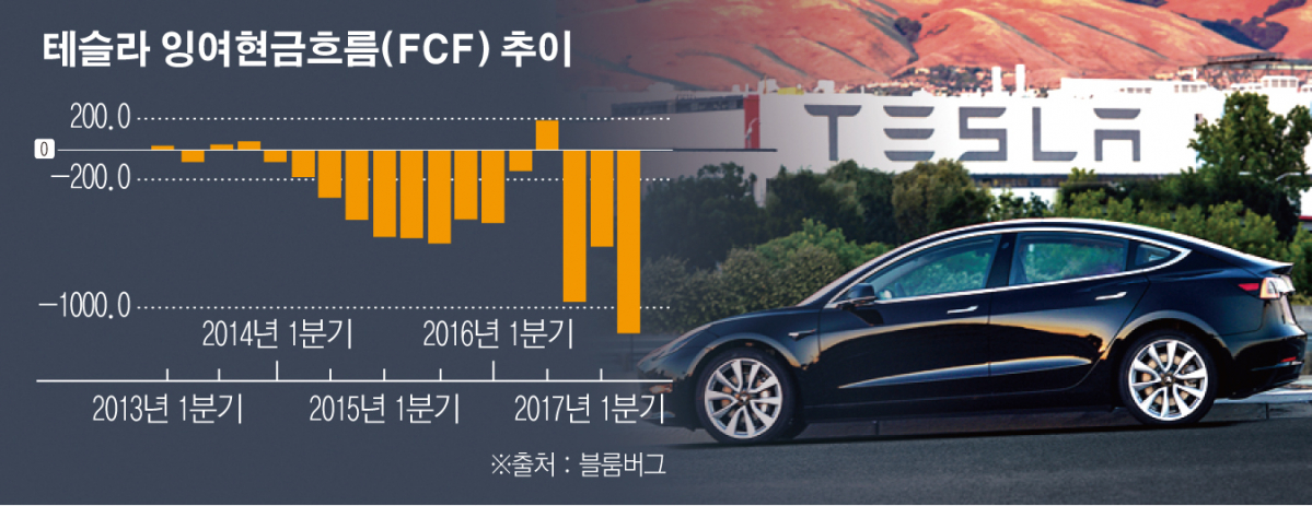 테슬라의 주가는 올해 들어서만 67% 올랐다. 주가 급등으로 회사 시가총액은 600억 달러에 육박하며 제너럴모터스(GM)와 포드자동차를 넘어서게 됐다. 그만큼 회사의 성장 전망에 베팅하는 투자자가 많다는 이야기다. 하지만, 아이러니하게도 테슬라는 적자를 면치 못하고 있다. 버는 것에 비해 투자 규모가 크기 때문이다. 블룸버그통신은 모델3 양산과 배터리 생산 증가에 주력하는 사이 회사의 잉여현금흐름은 급격히 악화됐다고 지적했다. 테슬라는 올해 2분기에만 11억6000만 달러의 현금을 소진했으며 올해 전체 최소 2억 달러의 현금을 쓸 것으로 전망된다. 테슬라는 총 30억 달러의 현금과 현금성 자산을 보유하고 있는 것으로 알려졌는데 고금리에 회사채를 발행한다는 것은 그만큼 유동성 부족 압력이 심하다는 증거라는 분석이 나오고 있다. 일각에서는 대량 생산라인도 갖추지 않은 상태에서 양산에 뛰어든 것은 엘론 머스크 최고경영자(CEO)의 과욕이라는 지적도 나온다. 지난해 8만4000대 정도 판 업체가 연간 40만대 가까이 생산을 한다는 게 무리라는 이야기다.