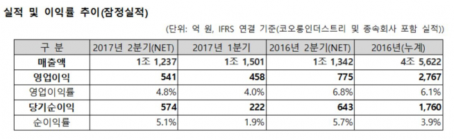 지난해 같은 기간과 비교해서는 납사 가격의 상승과 패션부문의 내수 부진, 환율 영향 등으로 수익성이 낮아졌으나, 지난 1분기보다는 전반적으로 수익성이 개선되는 모습을 보였다. 특히 외환 관련 이익 증가에 따른 기타손익 개선과 지분법이익 증가로 법인세비용차감전순이익과 및 분기순이익이 전분기 대비 큰 폭으로 상승했다.