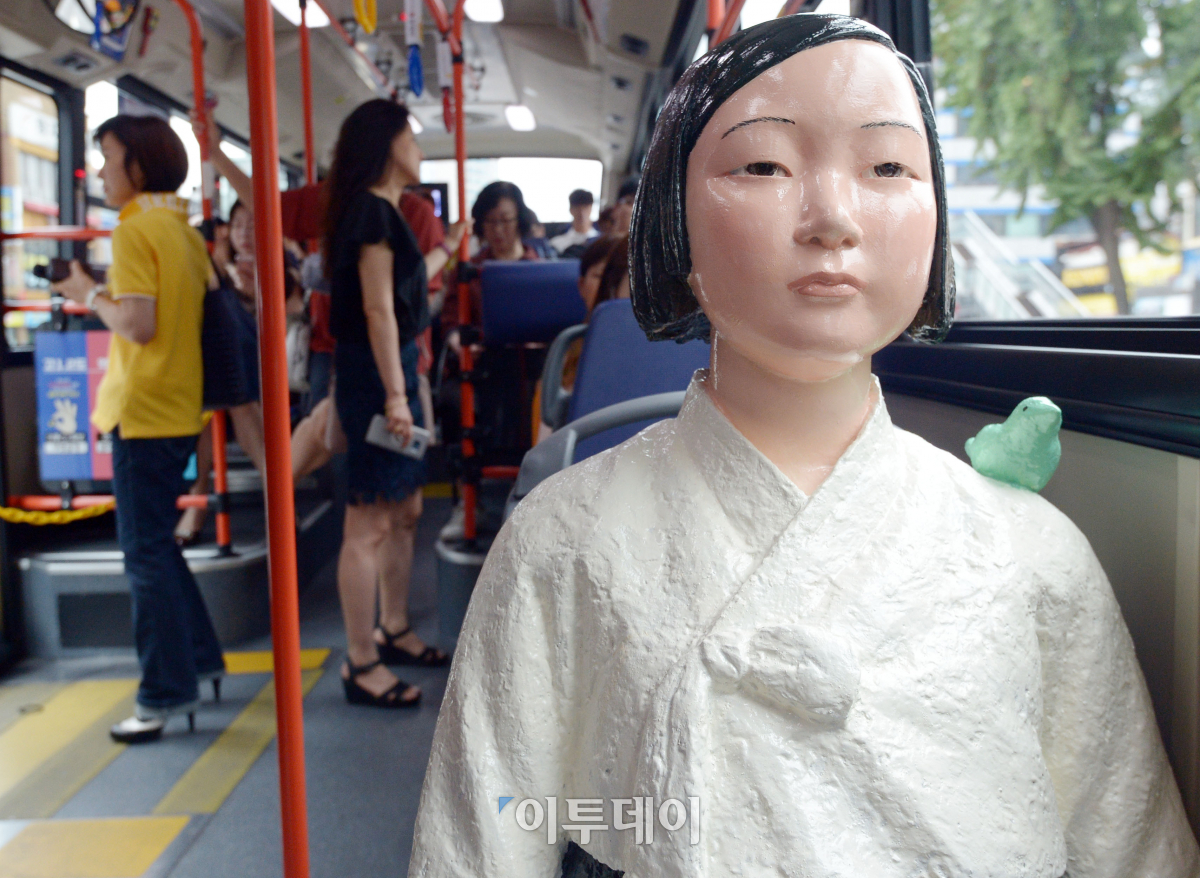 14일 오전 서울 우이동에서 중앙대까지 운행하는 151번 시내버스에 일본군 위안부 피해자들의 아픔을 기억하기 위한 평화의 소녀상이 설치돼 있다. 동아운수는 세계위안부의 날인 이날부터 내달 30일까지 151번 노선 5대에 특별제작한 소녀상을 태우고 운행한다. 이동근 기자 foto@