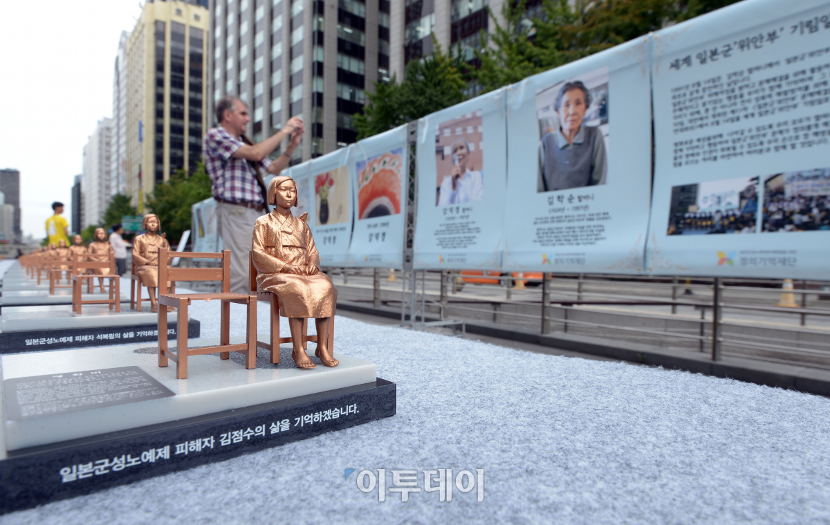 세계 위안부의 날인 14일 서울 청계광장에서 열린 '기림일, 인권과 평화로 소녀를 기억하다' 전시회에 평화의 소녀상 500개가 전시돼 있다. 일본군 성 노예 문제 해결을 위한 정의기억재단은 세계 일본군 위안부 기림일을 맞아 이날 오전 8시부터 오후 4시 14분까지 8시간 14분 동안 남·북한 위안부 피해 신고자 수에 해당하는 500개의 소형 평화의 소녀상을 전시한다. 이동근 기자 foto@