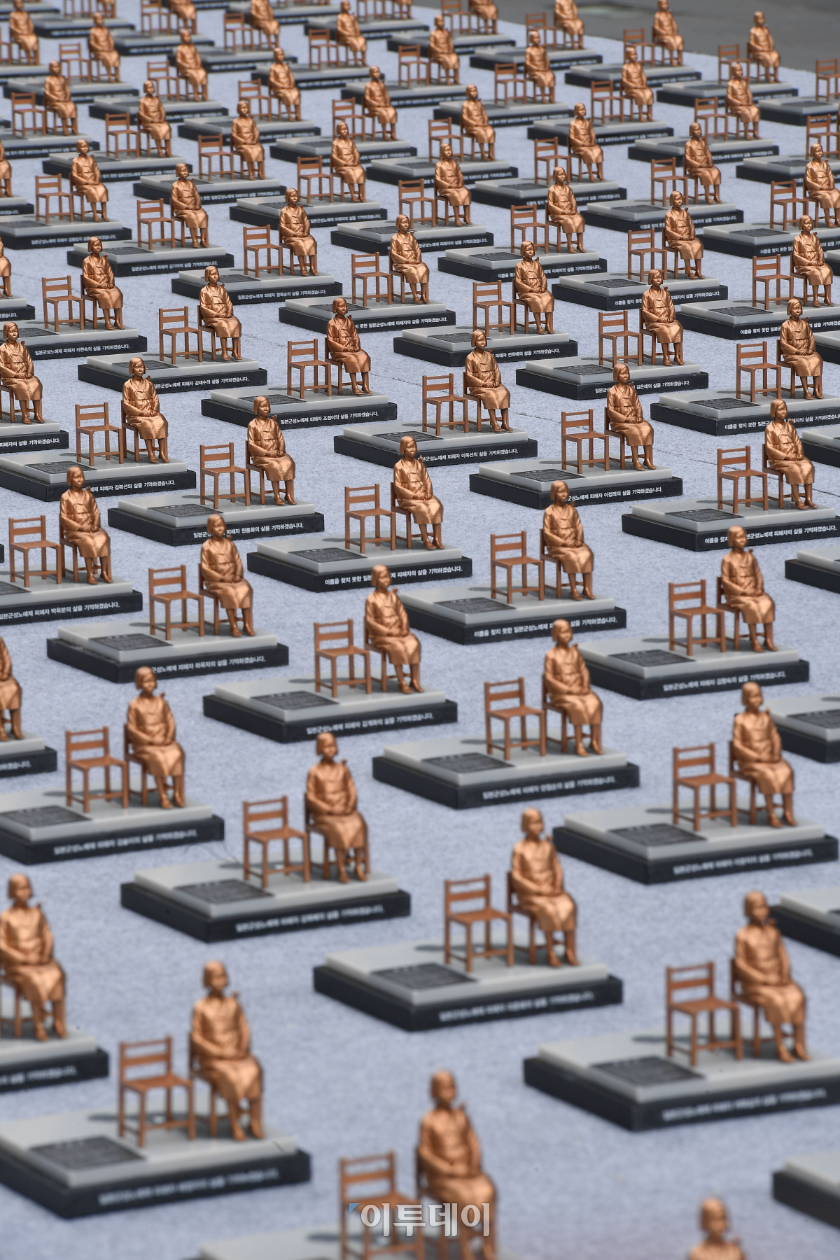 세계 위안부의 날인 14일 서울 청계광장에서 열린 '기림일, 인권과 평화로 소녀를 기억하다' 전시회에 평화의 소녀상 500개가 전시돼 있다. 일본군 성 노예 문제 해결을 위한 정의기억재단은 세계 일본군 위안부 기림일을 맞아 이날 오전 8시부터 오후 4시 14분까지 8시간 14분 동안 남·북한 위안부 피해 신고자 수에 해당하는 500개의 소형 평화의 소녀상을 전시한다. 이동근 기자 foto@