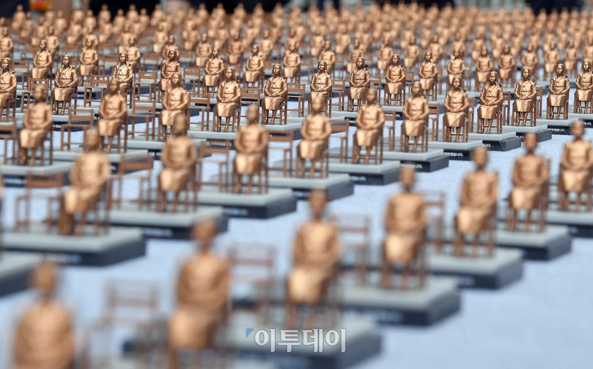 세계 위안부의 날인 14일 서울 청계광장에서 열린 '기림일, 인권과 평화로 소녀를 기억하다' 전시회에 평화의 소녀상 500개가 전시돼 있다. 일본군 성 노예 문제 해결을 위한 정의기억재단은 세계 일본군 위안부 기림일을 맞아 이날 오전 8시부터 오후 4시 14분까지 8시간 14분 동안 남·북한 위안부 피해 신고자 수에 해당하는 500개의 소형 평화의 소녀상을 전시한다. 이동근 기자 foto@
