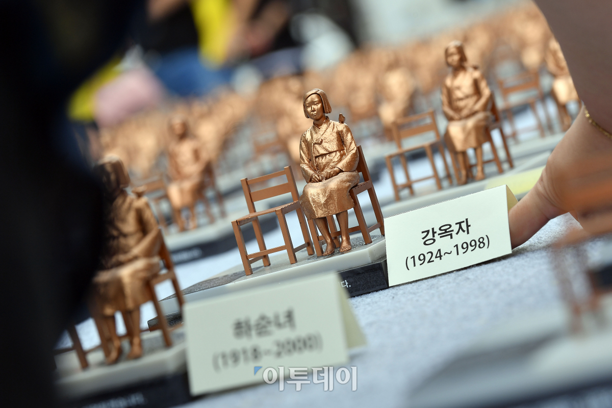 세계 위안부의 날인 14일 서울 청계광장에서 열린 '기림일, 인권과 평화로 소녀를 기억하다' 전시회에서 관계자가 평화의 소녀상에 명패를 부착하고 있다. 일본군 성 노예 문제 해결을 위한 정의기억재단은 세계 일본군 위안부 기림일을 맞아 이날 오전 8시부터 오후 4시 14분까지 8시간 14분 동안 남·북한 위안부 피해 신고자 수에 해당하는 500개의 소형 평화의 소녀상을 전시한다. 이동근 기자 foto@