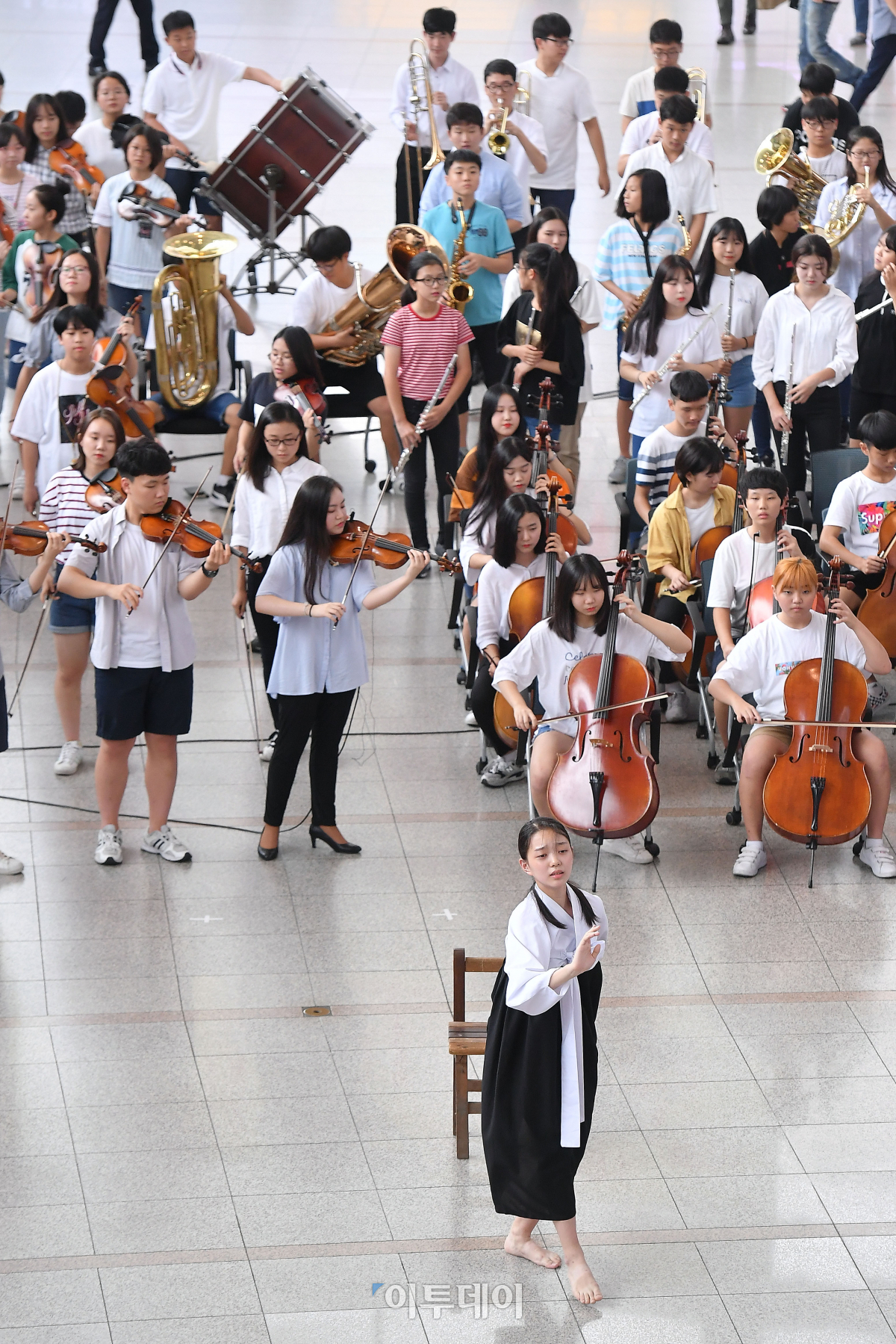 세계 위안부의 날인 14일 서울역 대합실에서 서울지역 300여 명의 중·고생들이 위안부 문제 해결을 위한 관현악과 합창, 무용 등으로 구성된 플래시몹을 펼치고 있다. 세계 위안부의 날은 1991년 위안부 피해자인 고(故) 김학순 할머니가 처음 위안부 피해 사실을 증언한 날로 세계 각지의 일본군 위안부 피해자를 기리는 날이다. 이동근 기자 foto@