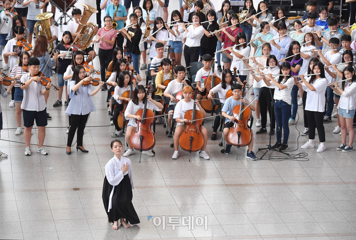 세계 위안부의 날인 14일 서울역 대합실에서 서울지역 300여 명의 중·고생들이 위안부 문제 해결을 위한 관현악과 합창, 무용 등으로 구성된 플래시몹을 펼치고 있다. 세계 위안부의 날은 1991년 위안부 피해자인 고(故) 김학순 할머니가 처음 위안부 피해 사실을 증언한 날로 세계 각지의 일본군 위안부 피해자를 기리는 날이다. 이동근 기자 foto@