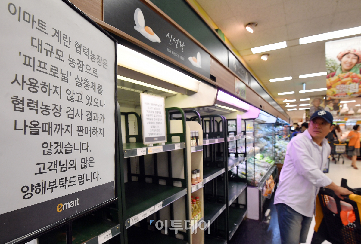 국산 계란에서도 살충제인 '피프로닐'과 '비펜트린' 성분이 검출 됨에 따라 대형마트 3사와 농협하나로마트, 슈퍼마켓, 편의점이 전국 모든 매장에서 일제히 계란판매를 중단한 15일 서울 용산구의 한 대형마트 내 텅 빈 계란 진열대 앞에 잠정 판매 중단 안내문이 게시돼 있다. 이동근 기자 foto@