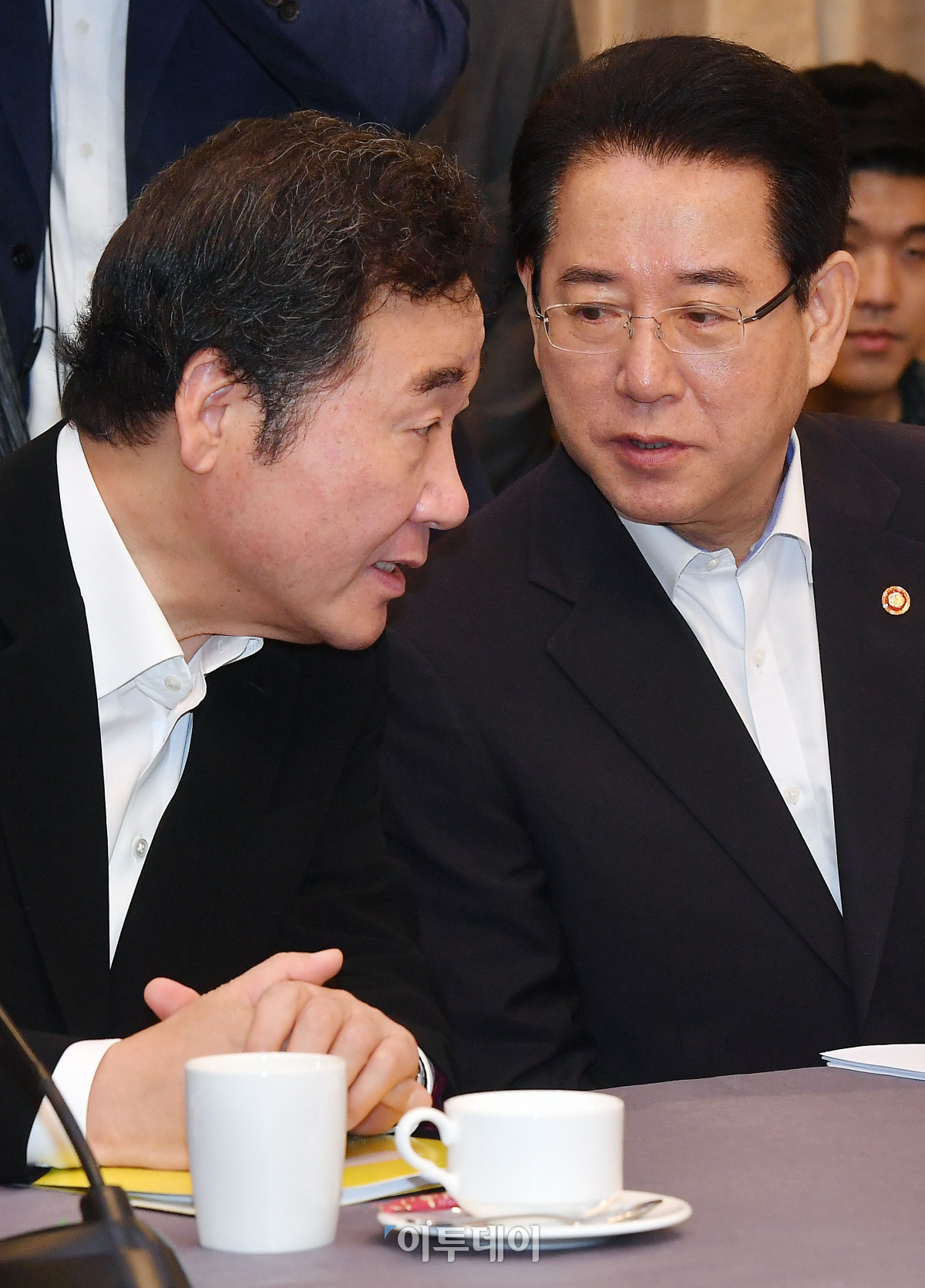 이낙연 국무총리(왼쪽)와 김영록 농림축산식품부 장관이 16일 오전 서울 여의도 국회에서 열린 고위당정청회의에서 대화하고 있다. 이동근 기자 foto@