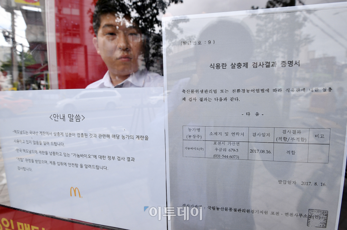 16일 서울 동대문구의 한 맥도날드 매장에서 직원이 식용란 살충제 검사결과 증명서와 안내문을 부착하고 있다. 맥도날드는 '살충제 계란'파동 이후 계란이 들어간 메뉴에 대해 한시적 판매 중단조치를 취하다 이날 오후 1시 경 나온 납품 농가의 적합 판정이후 다시 판매에 돌입했다. 이동근 기자 foto@