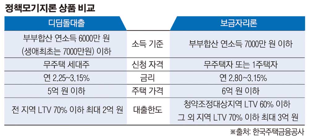 보금자리론은 이보다 소득수준이 높은 실수요자들이 이용한다. 보금자리론은 부부합산 연소득 7000만 원 이하인 무주택자나 1주택자가 6억 원 이하 주택을 구매할 경우 3억 원 한도로 대출을 해준다. 디딤돌 대출은 금리(2.25~3.15%)도 보금자리론(2.8~3.15%)보다 더 저렴하다.