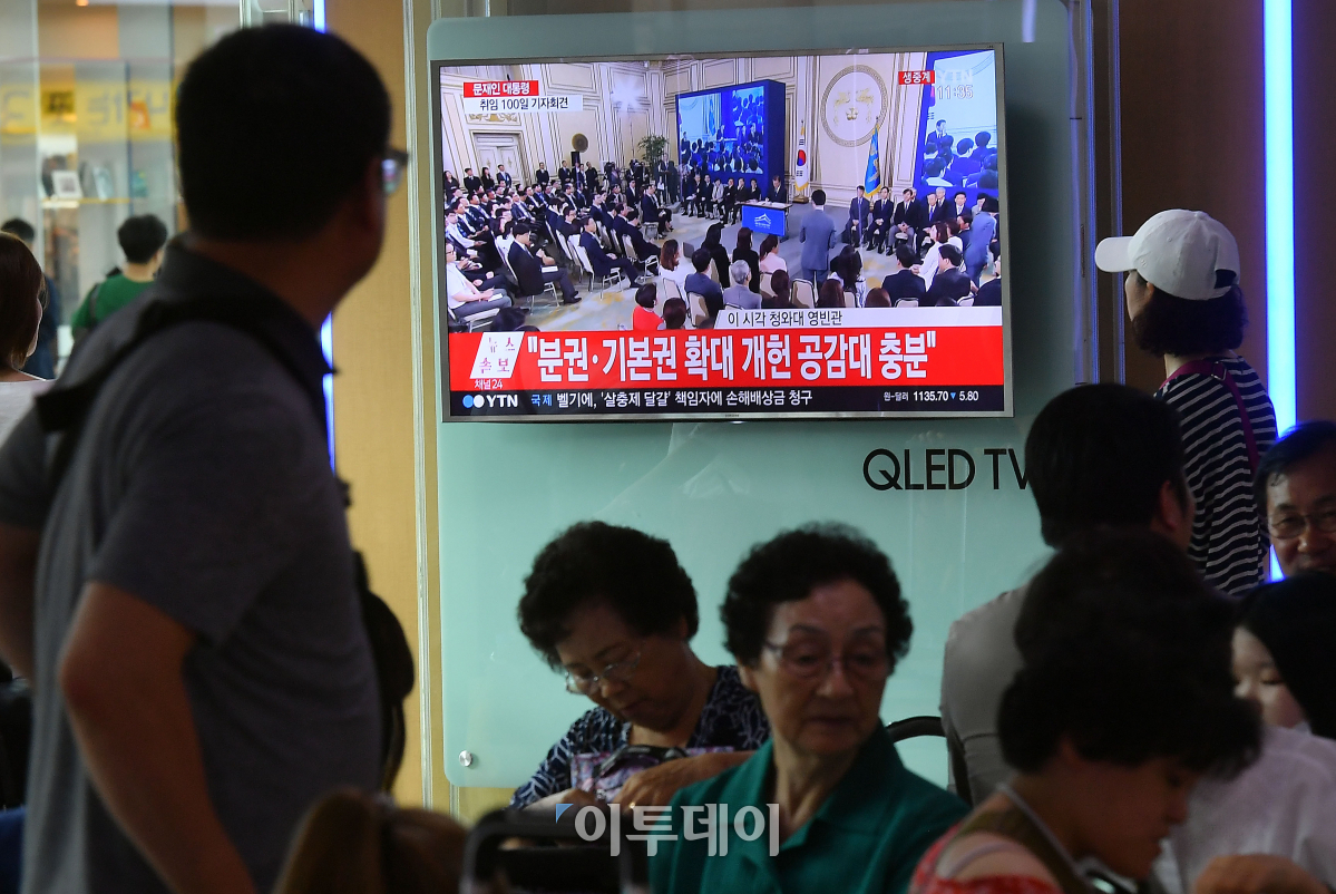 17일 서울 용산구 서울역 대합실에서 시민들이 TV 생중계 되는 문재인 대통령의 취임 100일 기자회견을 시청하고 있다. 이동근 기자 foto@