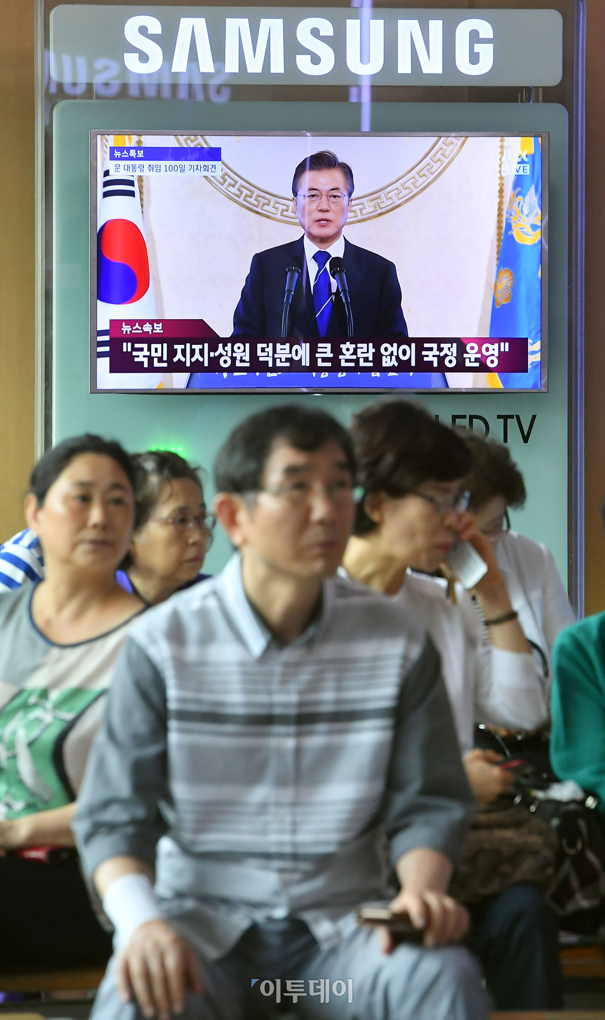 17일 서울 용산구 서울역 대합실에서 시민들이 TV 생중계 되는 문재인 대통령의 취임 100일 기자회견을 시청하고 있다. 이동근 기자 foto@