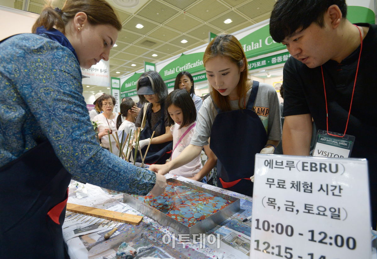 할랄산업엑스포코리아2017이 17일 서울 강남구 코엑스에서 열린 가운데 참관객들이 터키 전통예술인 에브루 체험을 하고 있다. 오는 19일까지 열리는 이번 박람회는 국내 할랄시장의 활성화를 위해 국제할랄컨퍼런스, 할랄 화장품 포럼, 세계 할랄 인증과 마케팅 등 다양한 컨퍼런스와 세미나가 열린다. 이동근 기자 foto@