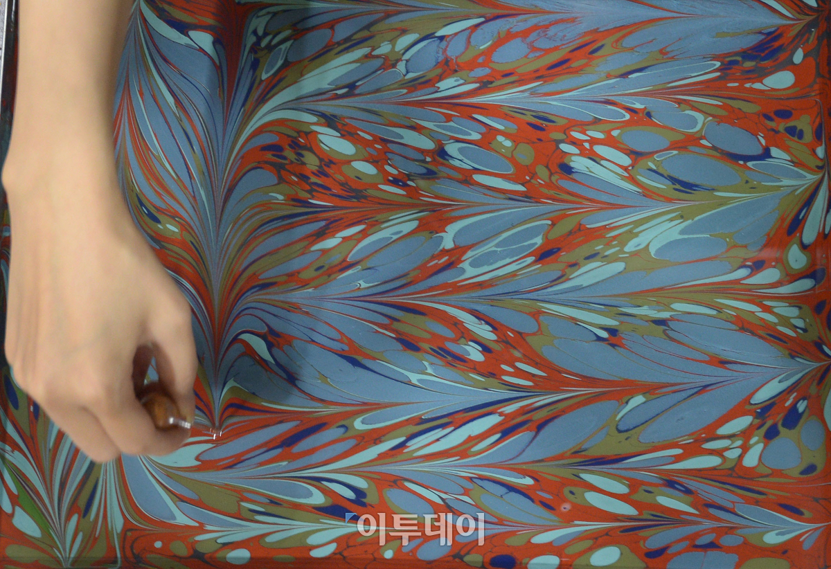 할랄산업엑스포코리아2017이 17일 서울 강남구 코엑스에서 열린 가운데 참관객이 터키 전통예술인 에브루 체험을 하고 있다. 오는 19일까지 열리는 이번 박람회는 국내 할랄시장의 활성화를 위해 국제할랄컨퍼런스, 할랄 화장품 포럼, 세계 할랄 인증과 마케팅 등 다양한 컨퍼런스와 세미나가 열린다. 이동근 기자 foto@