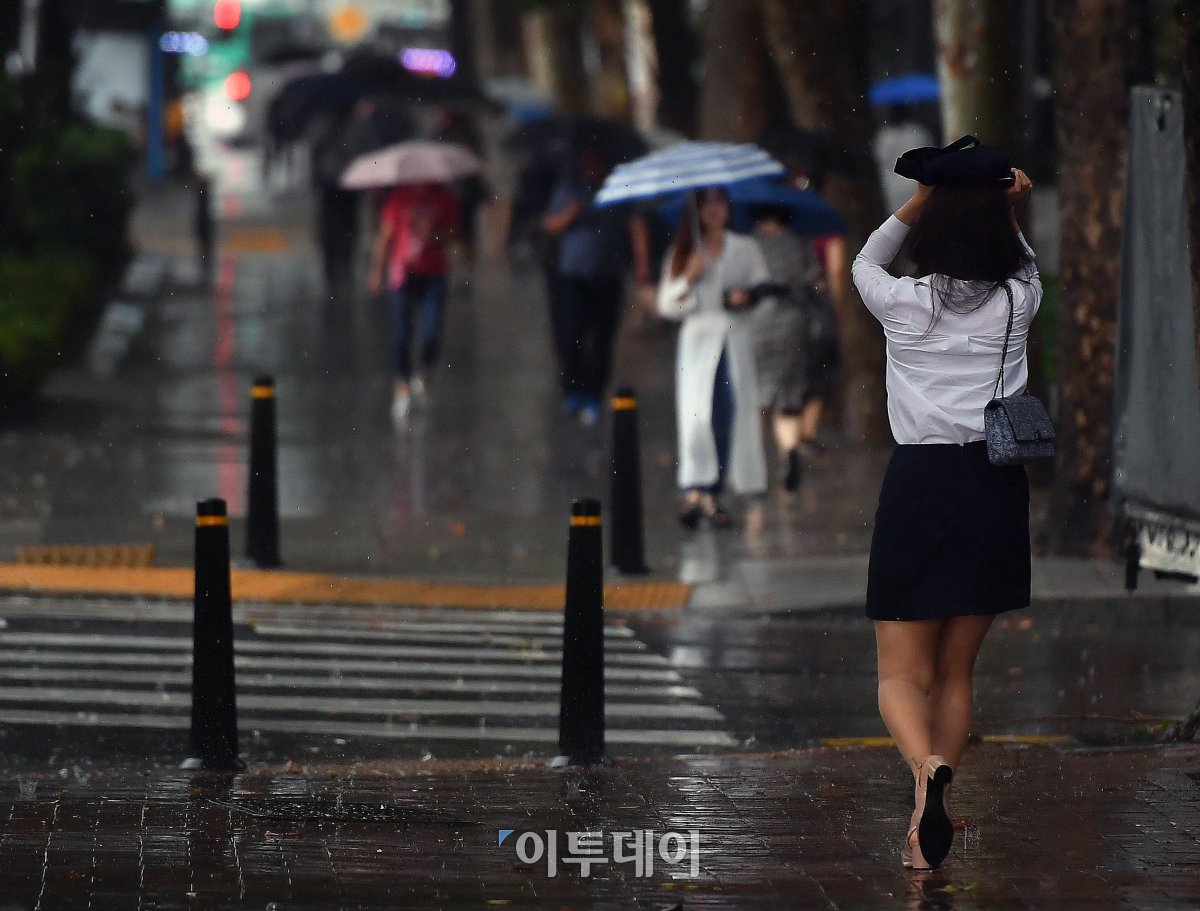갑작스런 소나기가 내린 17일 서울 강남구 삼성역 인근에서 우산을 준비하지 못한 한 시민이 가방으로 비를 가린 채 걸음을 재촉하고 있다. 이동근 기자 foto@