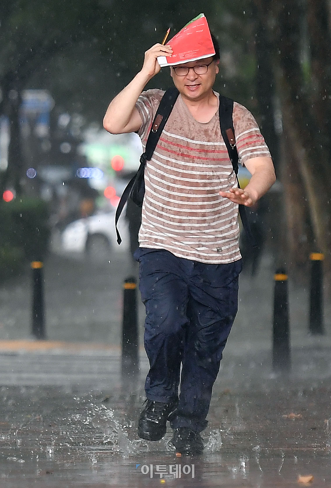 갑작스런 소나기가 내린 17일 서울 강남구 삼성역 인근에서 한 시민이 비를 피하기 위해 전력질주하고 있다. 이동근 기자 foto@