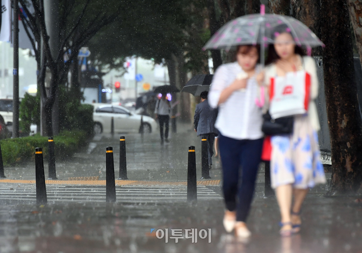 갑작스런 소나기가 내린 17일 서울 강남구 삼성역 인근에서 시민들이 우산을 쓴 채 걸음을 재촉하고 있다. 이동근 기자 foto@