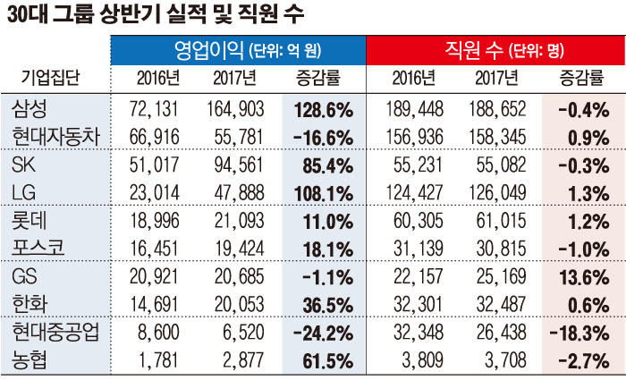 한편 30대 그룹의 영업이익이 크게 늘었음에도 불구하고 6월 말 기준 이들 업체의 직원 수는 96만3580명으로, 1년 전에 비해 3415명(0.4%) 감소했다.
