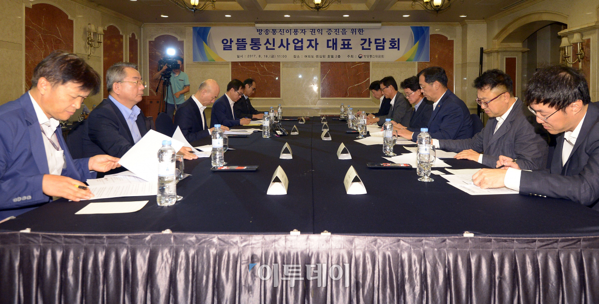 이효성 방송통신위원장(왼쪽에서 세 번째)과 참석자들이 18일 서울 여의도 켄싱턴호텔에서 열린 방송통신이용자 권익 증진을 위한 알뜰통신사업자 대표간담회에서 기념촬영을 하고 있다. 이동근 기자 foto@