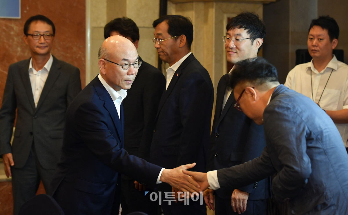 이효성 방송통신위원장이 18일 서울 여의도 켄싱턴호텔에서 열린 방송통신이용자 권익 증진을 위한 알뜰통신사업자 대표간담회에서 참석자들과 인사하고 있다. 이동근 기자 foto@