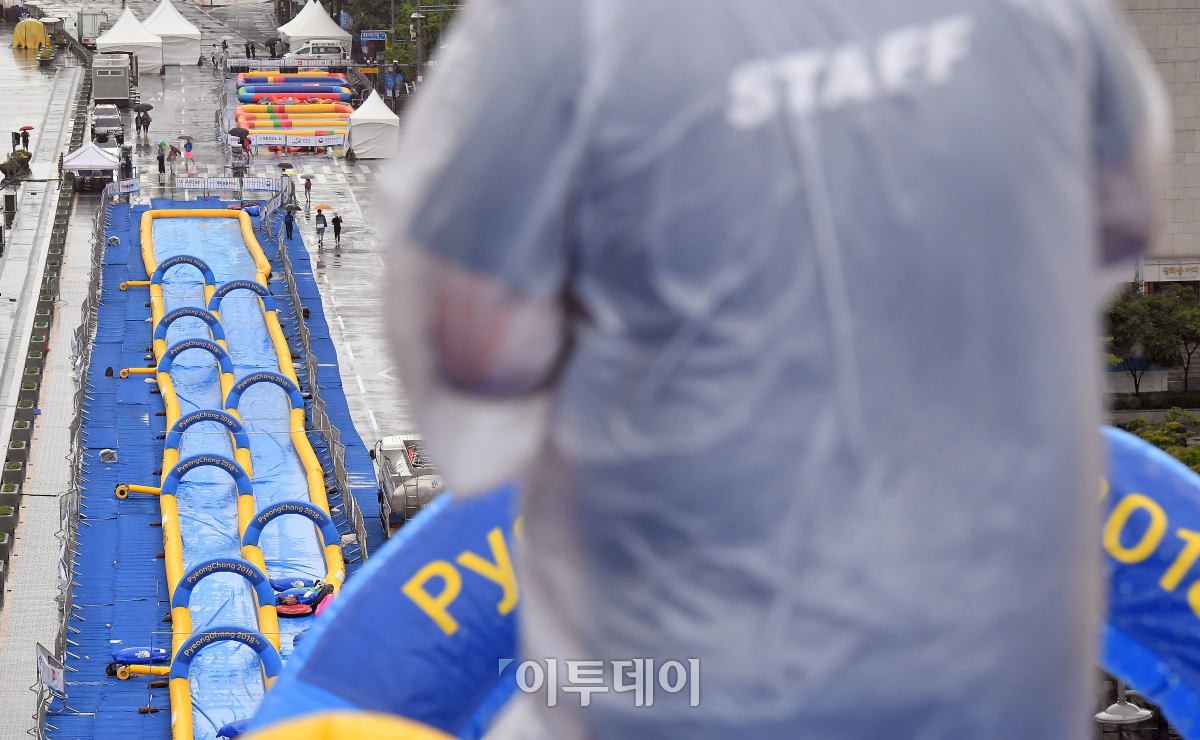 20일 서울 광화문광장에서 열릴 예정이었던 2018 평창동계올림픽 성공기원 '도심 속 봅슬레이'행사가 서울지역에 내려진 호우특보로 인해 취소된 가운데 관계자가 시설물을 점검하고 있다. 이동근 기자 foto@