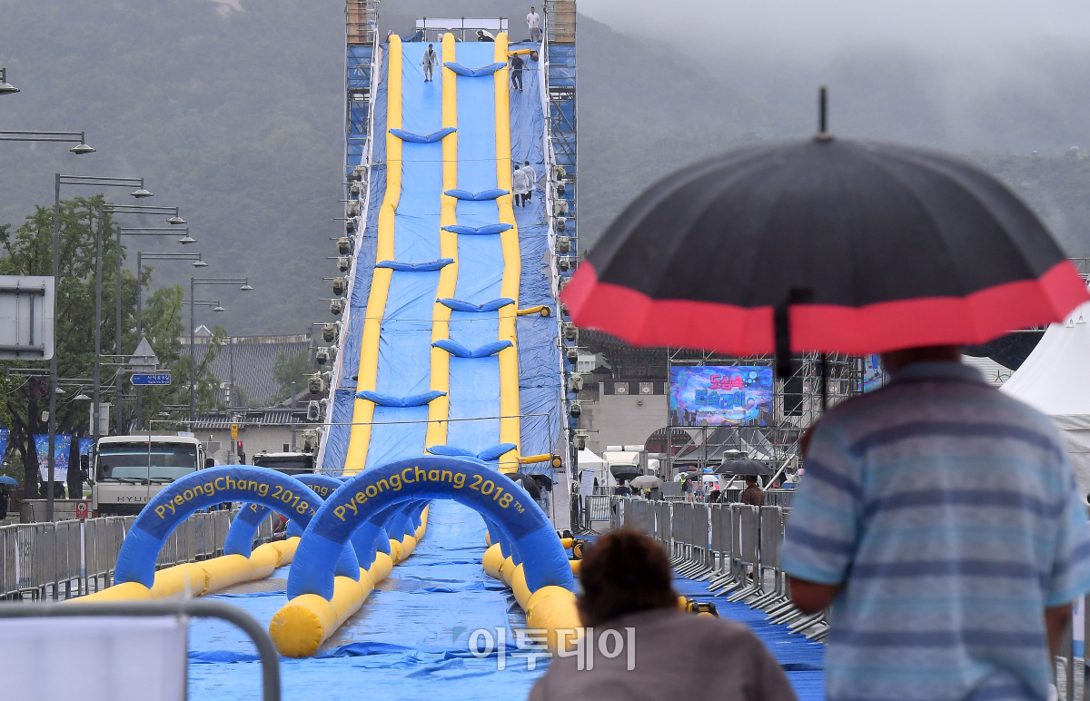 20일 서울 광화문광장에서 열릴 예정이었던 2018 평창동계올림픽 성공기원 '도심 속 봅슬레이'행사가 서울지역에 내려진 호우특보로 인해 취소된 가운데 시설물의 바람을 빼는 등 철거 준비 작업이 이뤄지고 있다. 이동근 기자 foto@