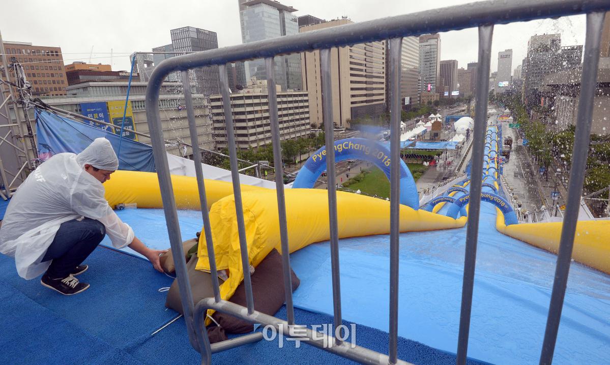 20일 서울 광화문광장에서 열릴 예정이었던 2018 평창동계올림픽 성공기원 '도심 속 봅슬레이'행사가 서울지역에 내려진 호우특보로 인해 취소된 가운데 관계자가 시설물을 점검하고 있다. 이동근 기자 foto@