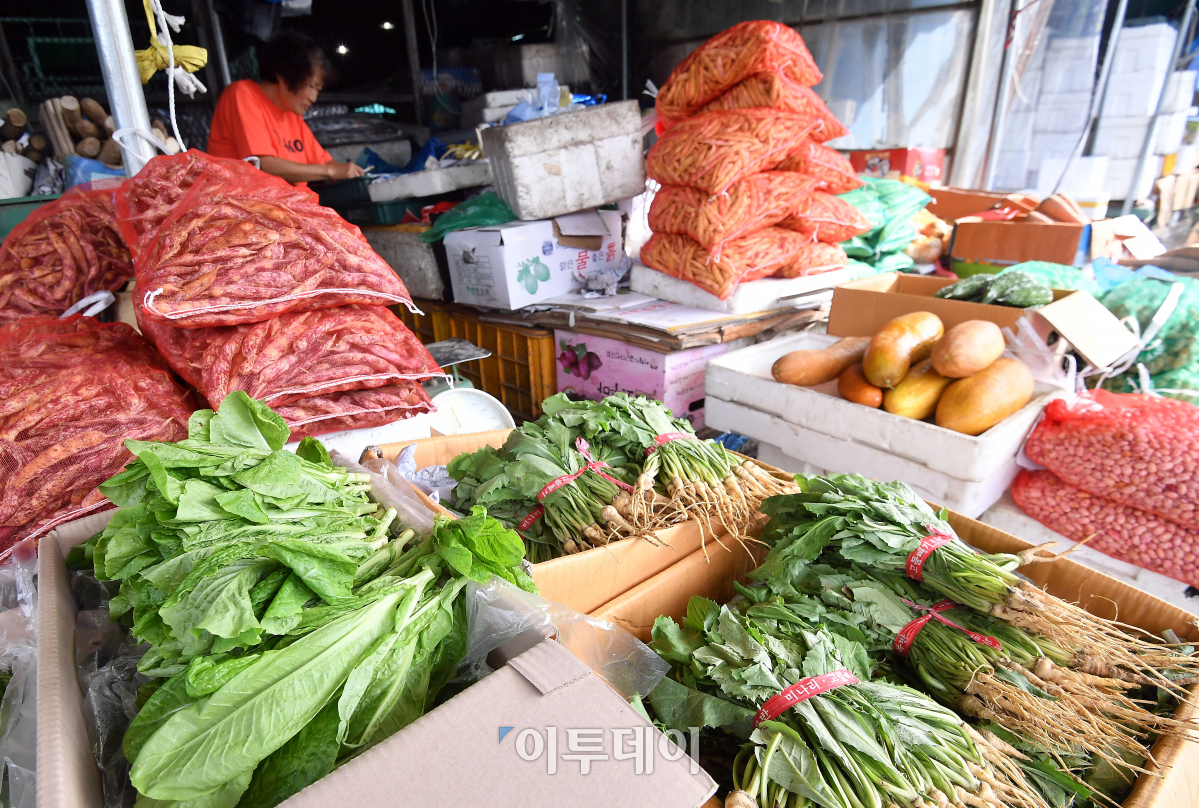 7월 생산자물가지수가 101.84로 6월보다 0.1% 상승하며 5개월만에 올랐다. 21일 오전 서울 송파구 가락시장에서 상인이 상품을 손질하고 있다. 7월 폭염과 폭우가 반복되며 채소류 출하량이 감소하며 전월보다 257.3%가 오른 상추를 비롯해 시금치(188.0%), 오이(167.7%) 등이 많이 올랐다. 생산자물가는 국내 생산자가 시장에 공급하는 상품과 서비스의 도매 물가를 뜻하며, 이후 소비자물가에 영향을 준다. 이동근 기자 foto@