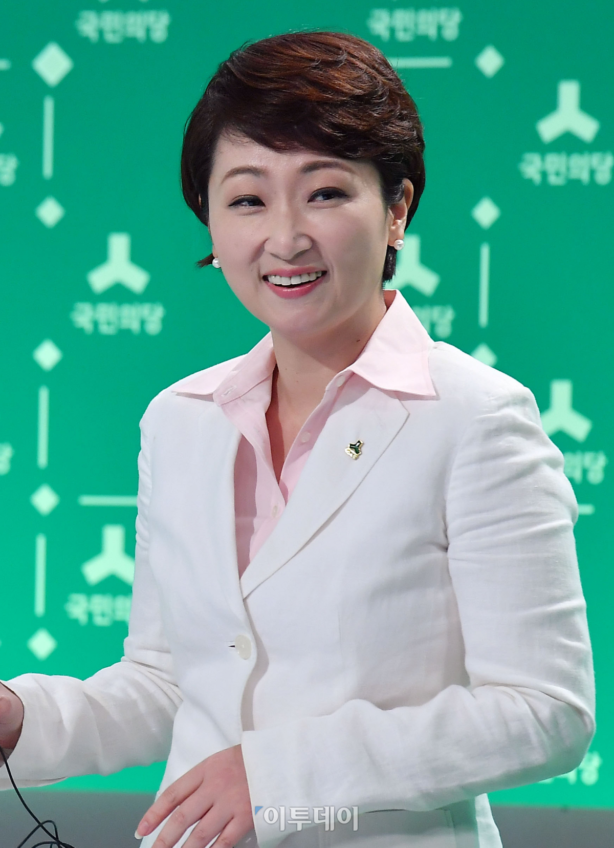 국민의당 8.27 전당대회 당 대표선거에 출마한 이언주 후보가 21일 서울 마포구 상암MBC방송센터에서 열린 지상파 3사 공동 TV토론회에 참석해 리허설을 하고 있다. 이동근 기자 foto@